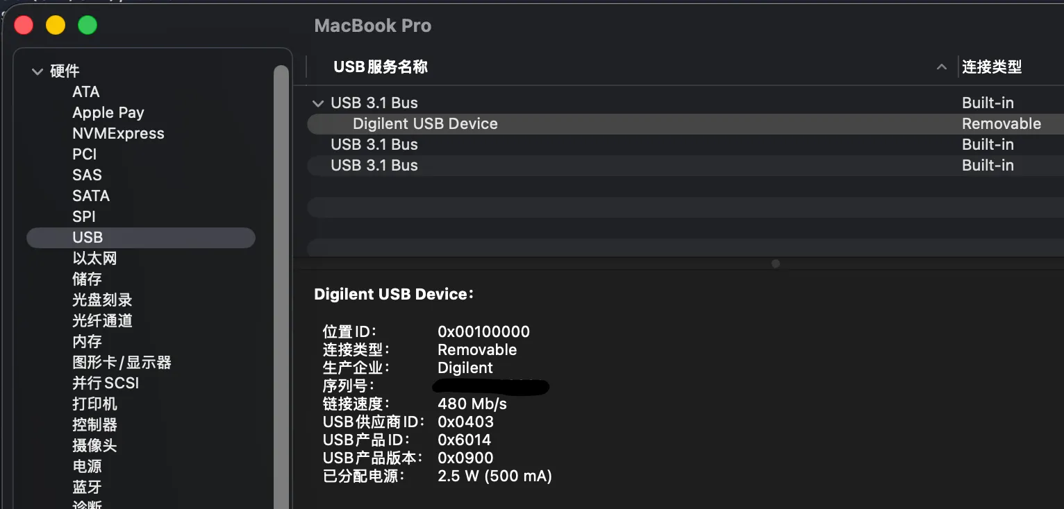 驱动安装成功后,将Alinx JTAG下载器通过USB连接至Mac。打开系统信息.app(快捷键Command + Space,输入“系统信息”),在左侧边栏选择USB。在右侧列表中应能看到对应的FTDI设备信息。请记录设备信息中的USB产品ID,通常为0x6014,后续步骤将使用此ID。