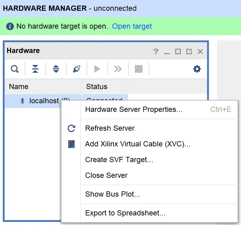 - 在左侧连接树中的 localhost 项目上右键单击,选择 Add Xilinx Virtual Cable (XVC) …。