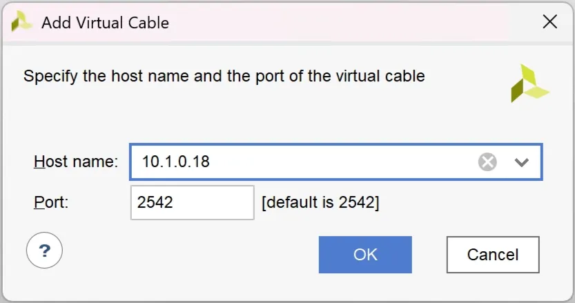 - 在弹出的对话框中,输入运行 jtag-remote-server 的服务器的 IP 地址或主机名,端口保持默认的 2542。